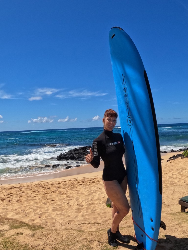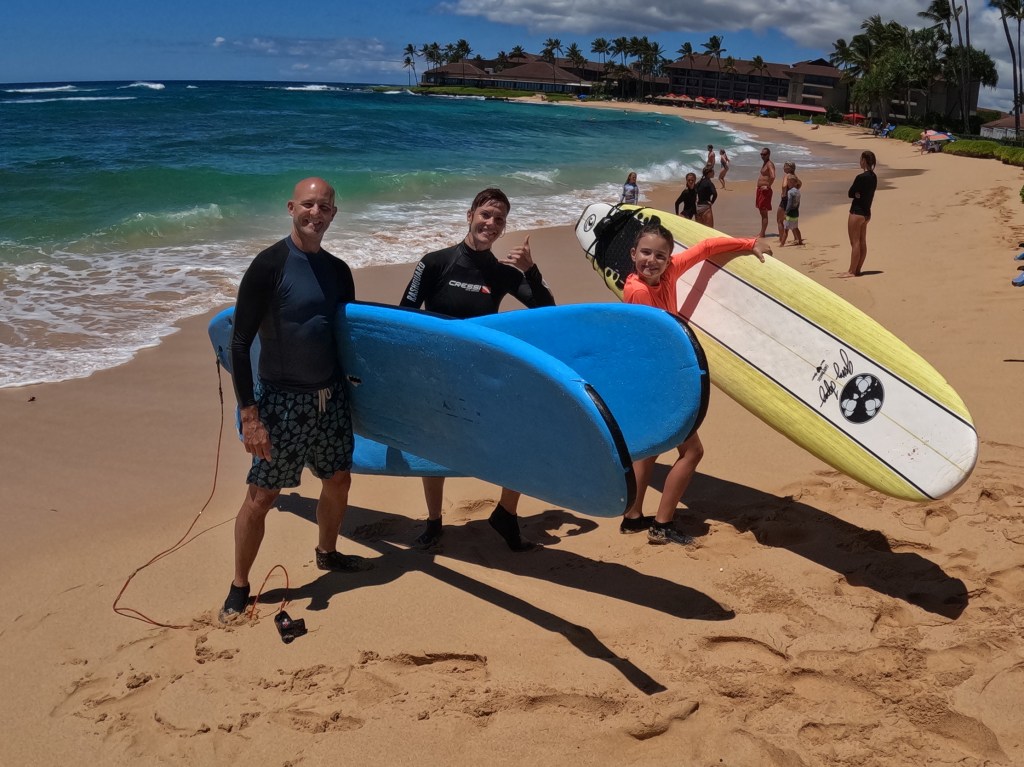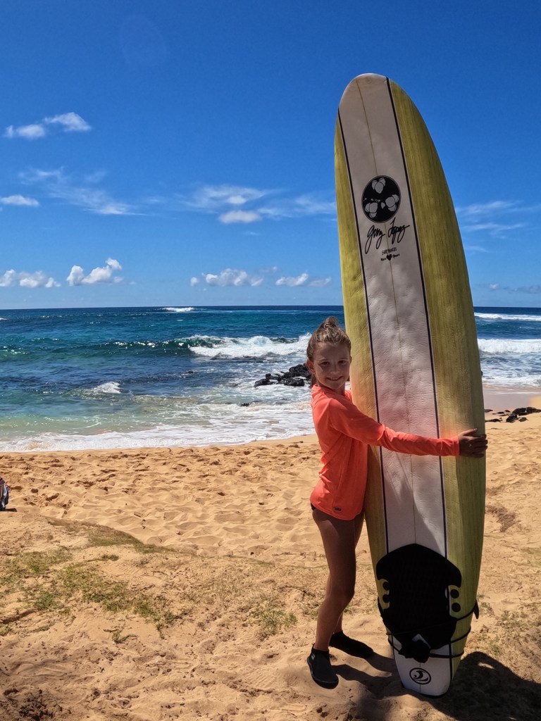 Qui ne s’est jamais imaginé sur une planche de surf à Hawaï? Nous voici partis pour un petit cours sur la plage de Poipu! Car il faut être honnête: n’ayant aucune expérience en la matière, il est difficile de se lancer avec de telles vagues!