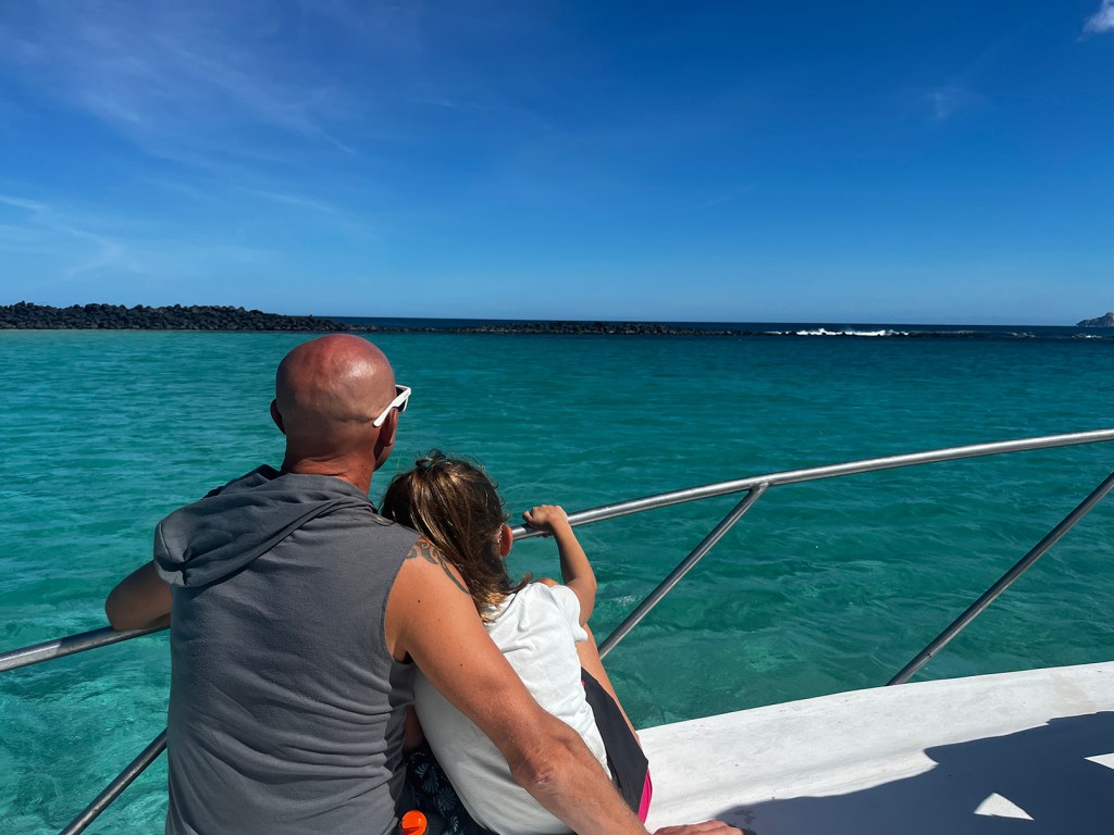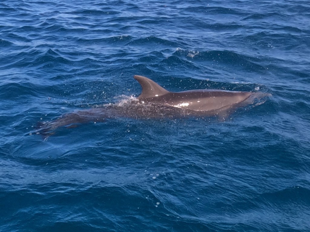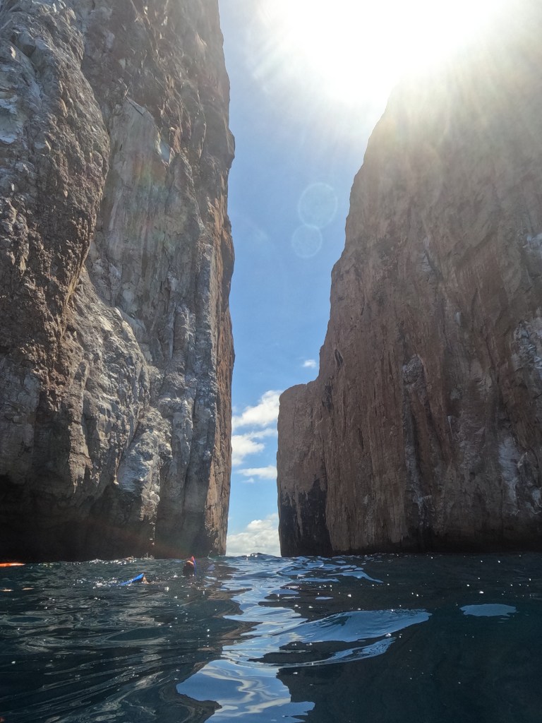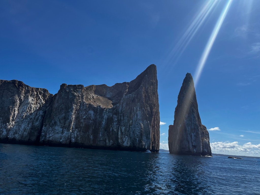 Kicker Rock est un îlot, ou plutôt un gros rocher, perdu au large et est réputé comme un excellent site de plongée. Comme l’avion nous attendait le lendemain, nous n’avons pas plongé, mais uniquement fait du snorkeling. Malheureusement, l’endroit n’est absolument pas adapté au snorkeling, même si tous les tour-opérateurs proposent cette excursion… En effet, il s’agit juste d’un tombant qui est le prolongement du rocher et où on ne voit pas de fond. De plus, la houle est forte, ce qui n’est pas idéal pour cette activité. Même si on peut apercevoir furtivement l’un ou l’autre requin ou quelques tortues, il y a bien d’autres sites plus adaptés aux Galapagos! Heureusement, nous avons eu la chance de voir des dauphins pendant la traversée et ça, c’est toujours aussi magique 😍