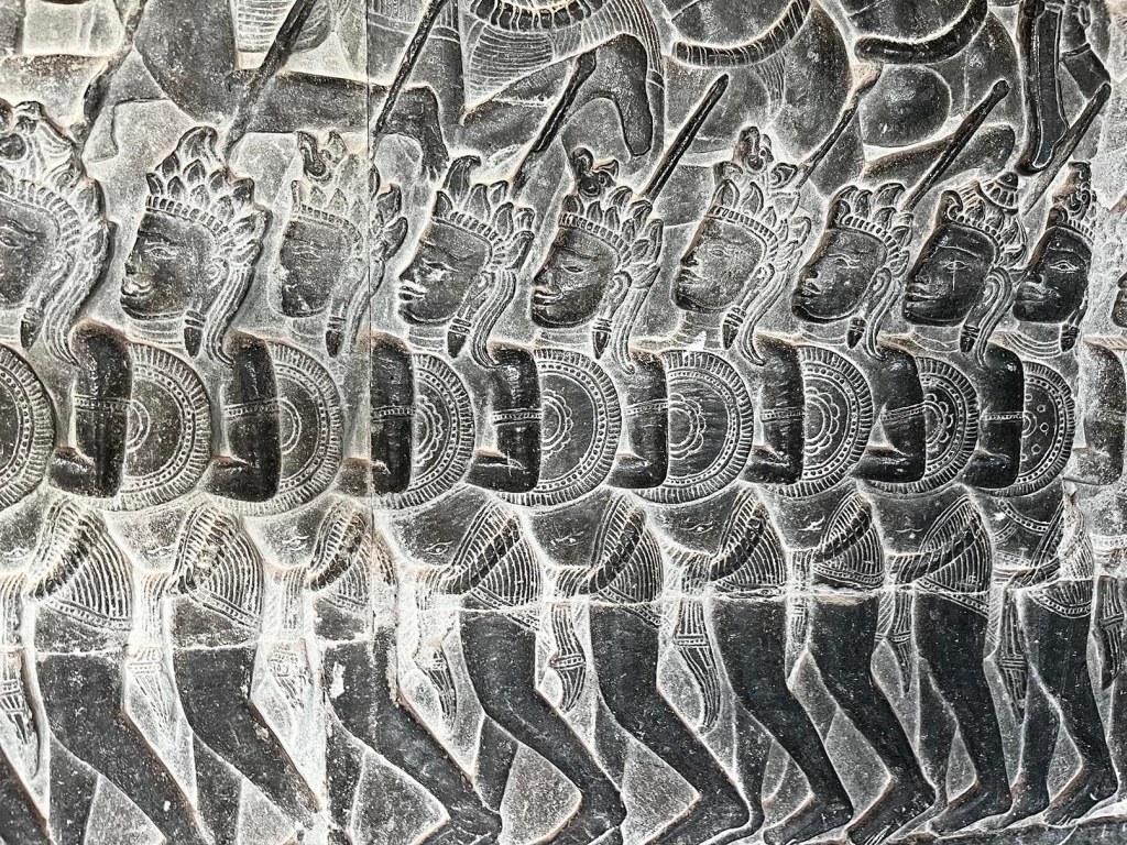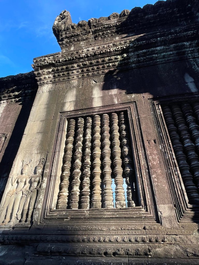 Il y a des colonnes partout au niveau des fenêtres et elles sont toujours en nombre impair de 5 ou 7 qui est le symbole de l’immortalité. Cela empêche aux gens d’entrer, tout en laissant passer la lumière. Il y a trois niveaux et le dernier niveau était réservé au roi et aux gourous. Le peuple n’osait aller qu’au premier niveau, là où il y a les bas-reliefs. Le haut des tours est en symbole de fleur de lotus