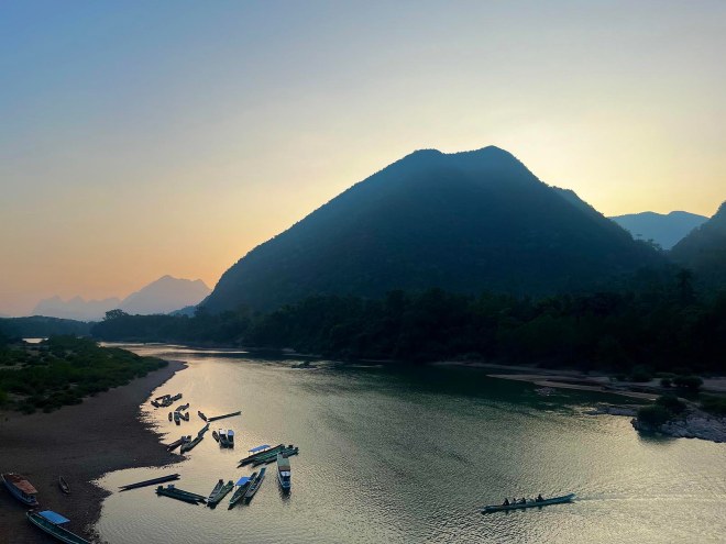 Aujourd’hui, après un petit déjeuner bien emmitouflés (il fait 8 degrés et nous mangeons dehors!), descente de la paisible rivière Nam Ou jusqu’à Nong Khiaw, un charmant village encerclée par d’incroyables montagnes karstiques. Quoi de mieux pour se réchauffer que de faire une petite grimpette au point de vue?