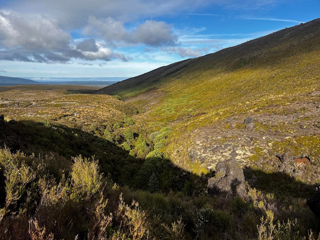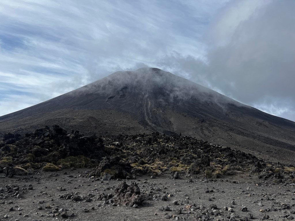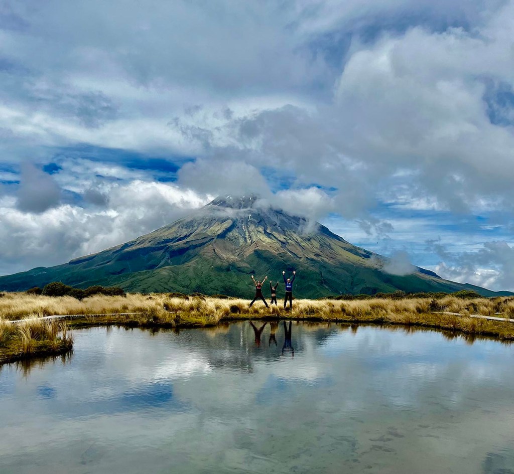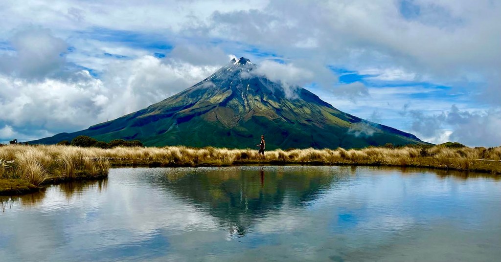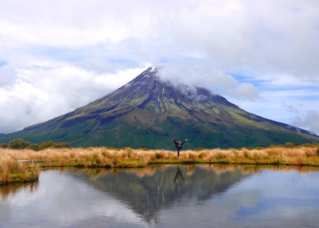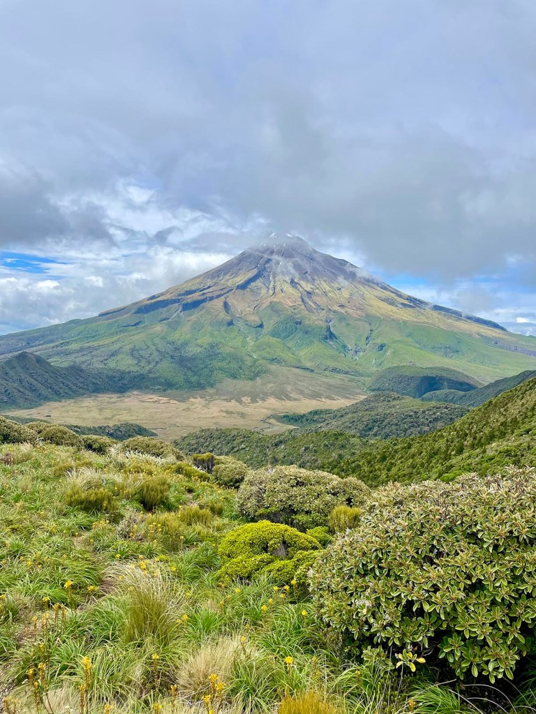 Magnifique volcan Taranaki qui se laisse admirer après une jolie grimpette progressive de 800m de dénivelée. Notre rando de récupération du jour après les 22 km du jour précédent!