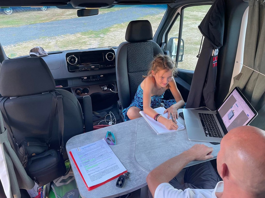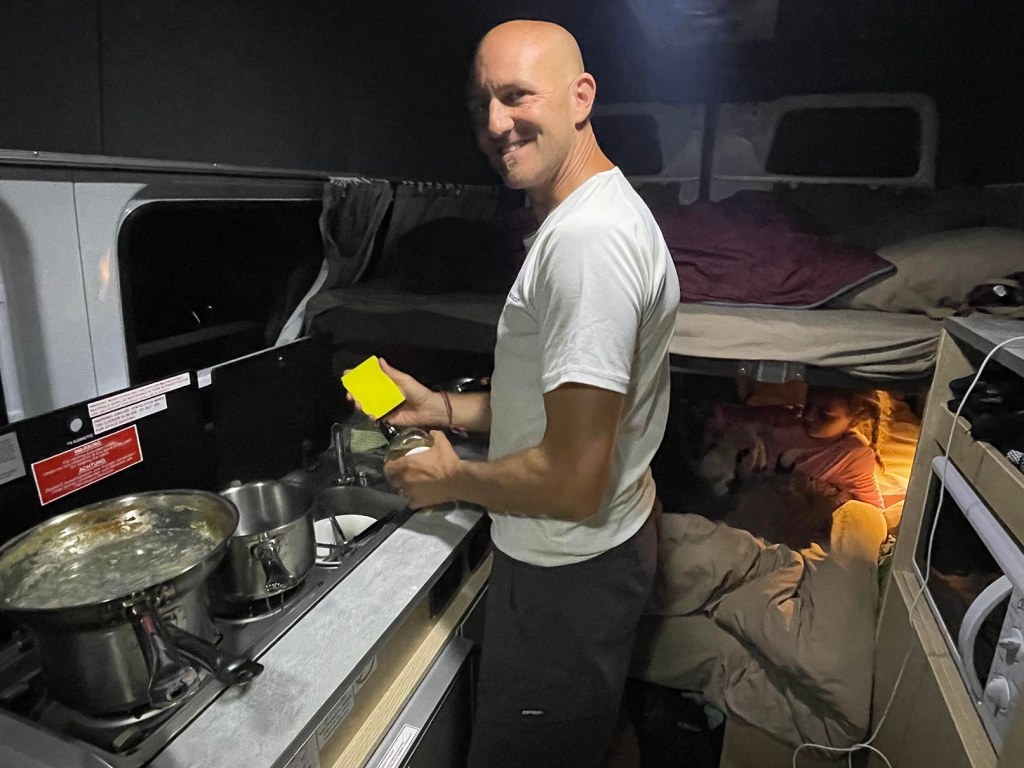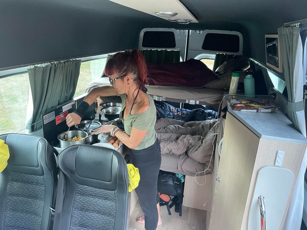 ArrivĂ©s en fin de journĂ©e, on vit dans quelques mĂštres carrĂ©s. Pour ceux qui ne connaissent pas cela, imaginez vivre dans quasi toutes les piĂšces de votre appartement compactĂ©es en un espace trĂšs exigu. C’est un chassĂ©-croisĂ© car nous avons, en plus, nos gros sacs (nos dressings) en travers du sol car il n’y a pas vraiment de coffre. La table sert Ă  la fois de table Ă  manger et de bureau. Pour cuisiner ce n’est pas l’espace des cuisines de Top Chef 😂. Il faut ĂȘtre inventif et organisĂ©. Pour la vaisselle il en est de mĂȘme en ajoutant la touche discrĂ©tion Ă©tant donnĂ© que Lola se couche souvent au mĂȘme moment juste Ă  quelques centimĂštres.