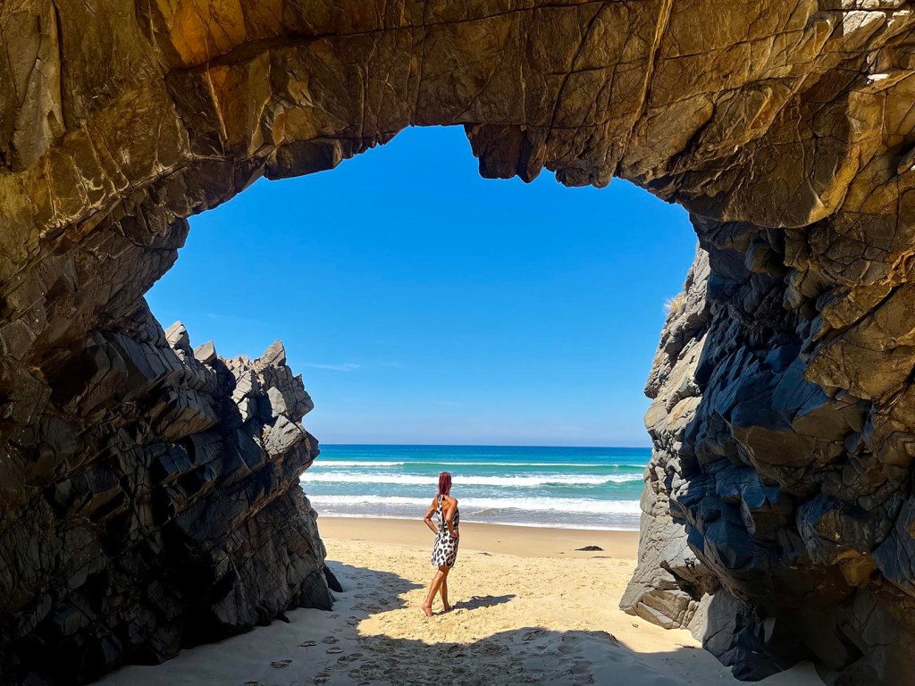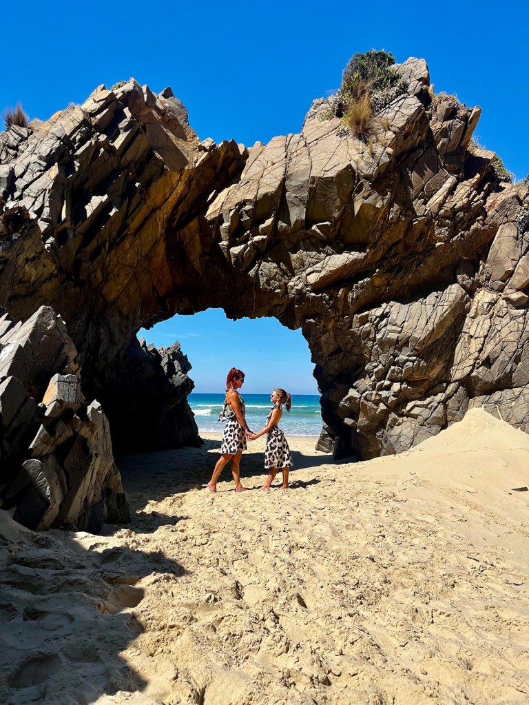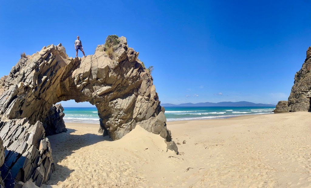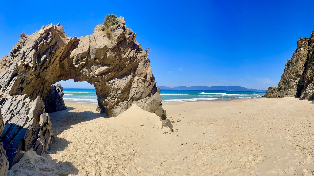 Sur Bruny Nord, une petite plage bien cachée au milieu des falaises révèle une superbe arche bien photogénique… De plus, l’endroit est désert, ce qui n’est pas pour nous déplaire! Une perle 🤩