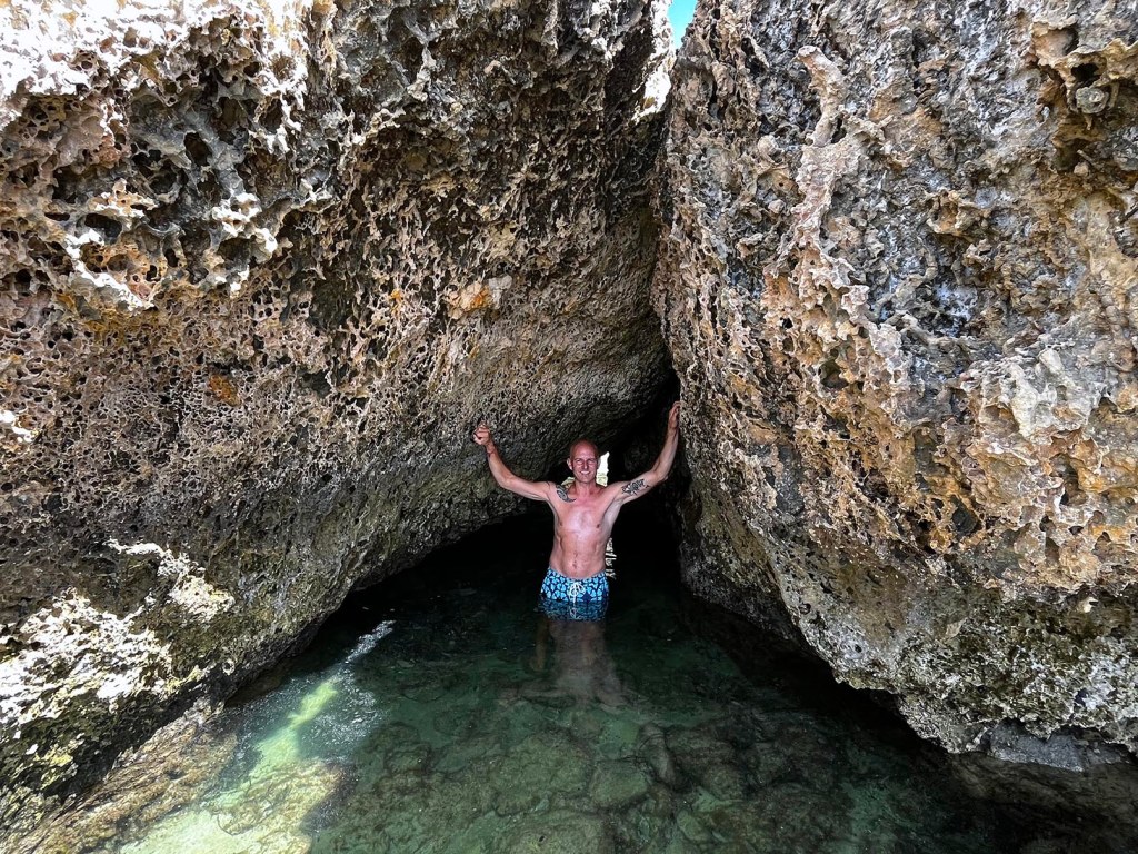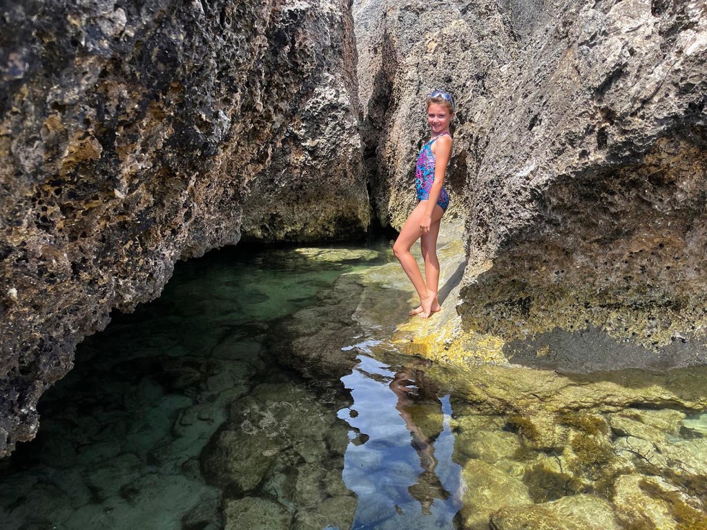 Voilà une plage qui ravira petits et grands, surtout par son accès qui se fait à travers des rochers comme par un passage secret! Une grande piscine naturelle s’y trouve ainsi que de nombreuses petites grottes à découvrir. Un vrai labyrinthe!