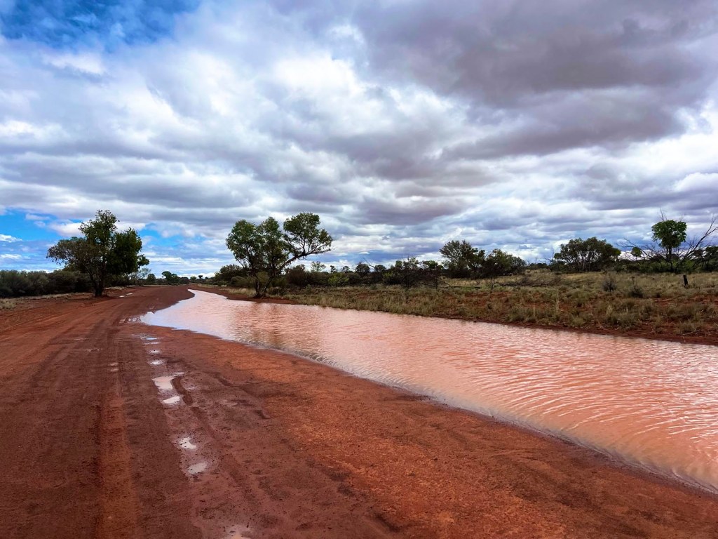 Si vous pensez que l’aventure s’arrête là, vous vous trompez! Après une lueur d’espoir matinale, nous voilà repartis sur la route/piste afin d’espérer rejoindre Alice Springs. Oui mais voilà, la tempête de la nuit a vraiment fait des ravages et il y a eu des conséquences: nous voici devant une rivière (normalement asséchée) dont les flots et le courant sont clairement trop importants pour la traverser. Pourtant, cette rivière nous sépare de la seule pompe à essence de cette région. Oui car ici dans le centre australien, tant l’eau que l’essence ou encore la nourriture, sont des denrées rares dont il faut s’approvisionner dès qu’on peut. Nous avons vraiment l’impression de revivre notre voyage en Namibie!