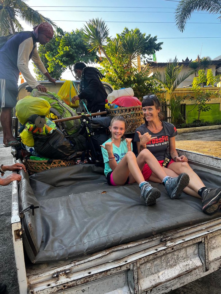 Réveil à 6h du matin suivi d’un petit-déjeuner, nous partons à l’arrière d’une camionnette jusqu’au départ de l’ascension en passant d’abord au bureau des enregistrements. Nous sommes déjà impressionnés du monde présent qui se lance dans cette aventure/ce défi sportif. Toutefois, Lola est la seule enfant de l’aventure!