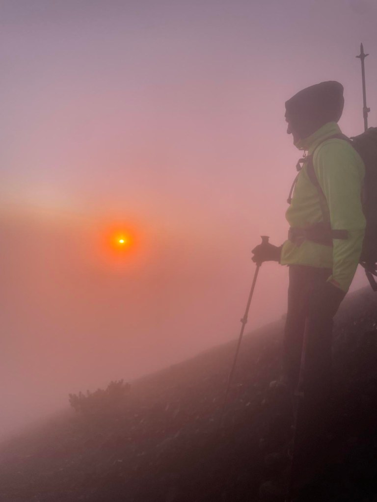 De notre côté, nous atteindrons le sommet à 5h du matin fouettés par un vent glacial pendant une bonne moitié de la montée. Nous devrons du coup attendre 1h15 que les lueurs du soleil apparaissent dans un brouillard polaire emmitouflés dans toutes nos couches.