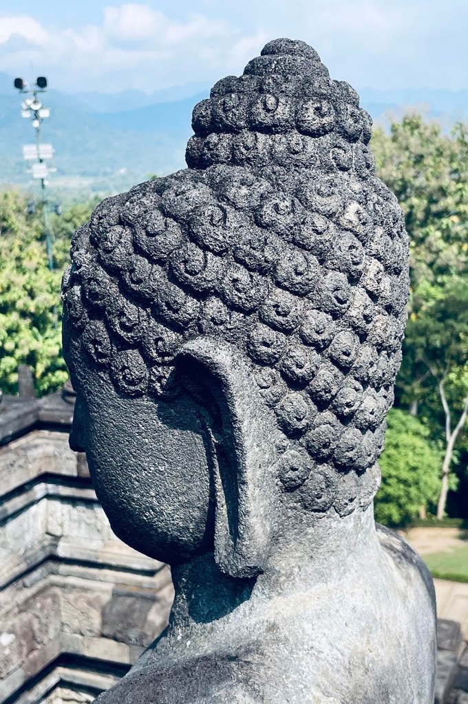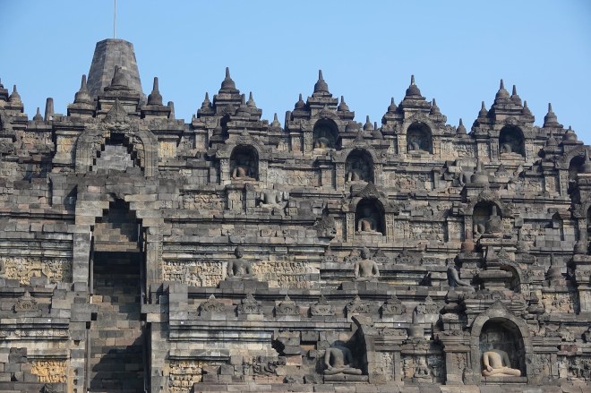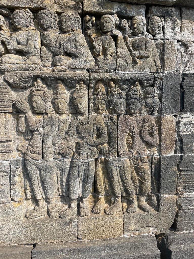 Vu d’en haut, la structure représente d’ailleurs un mandala issu du bouddhisme ou alors une fleur de lotus. Plus de 2600 bas-reliefs recouvrent l’ensemble! Les derniers étages circulaires sont particulièrement intéressants car c’est au sommet qu’on trouve plusieurs centaines de niches et de cloches en pierre contenant des statues de Bouddha en position du lotus.