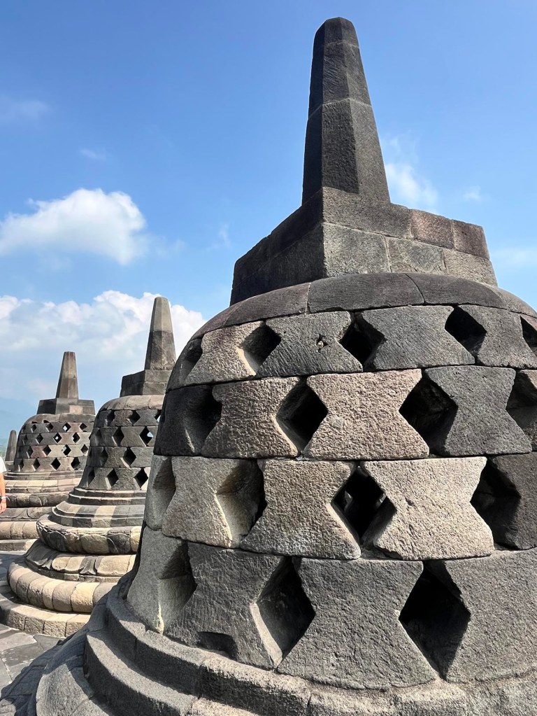 Le temple de Borobudur est une sorte de pyramide ou stupa, avec six premiers niveaux carrés et trois derniers circulaires. Il est composé de 60’000 mètres cube de pierre, soit deux millions de blocs de pierre. Autant vous dire que le site est imposant!