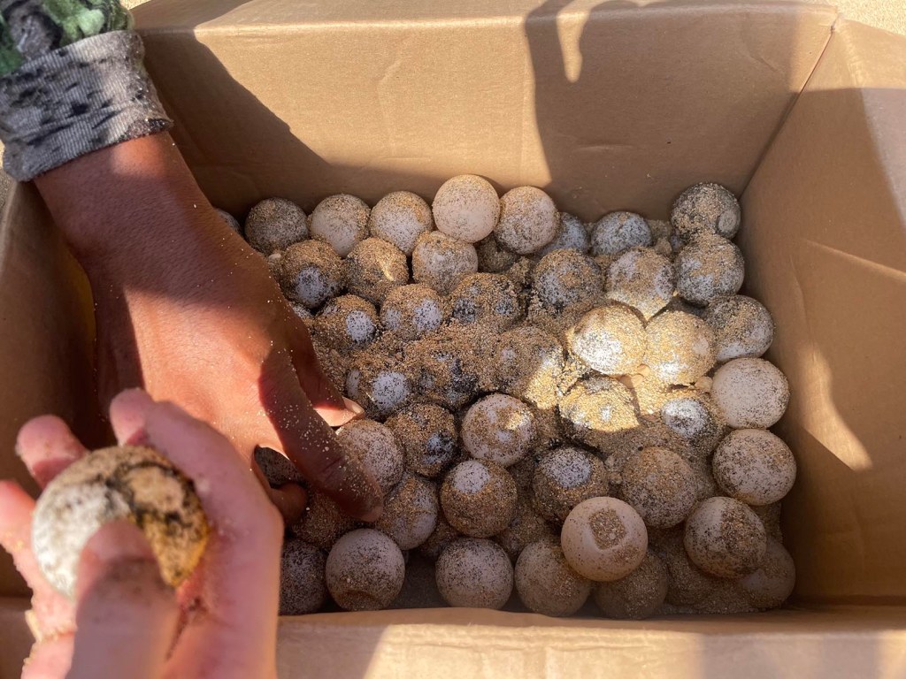 Les œufs sont placés dans le sable à 40-50 cm de profondeur pendant 55 jours et les tortillons, après être sortis de l’œuf, grimperont 2 cm par 24h et seulement la nuit. L’objectif étant évidemment d’atteindre la surface, puis d’aller à l’océan.