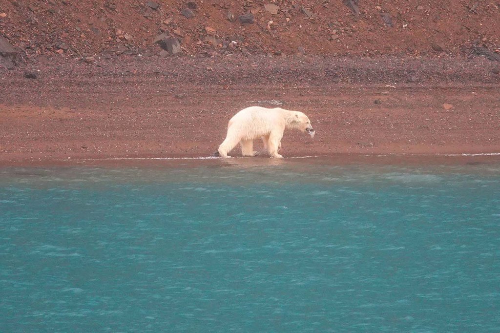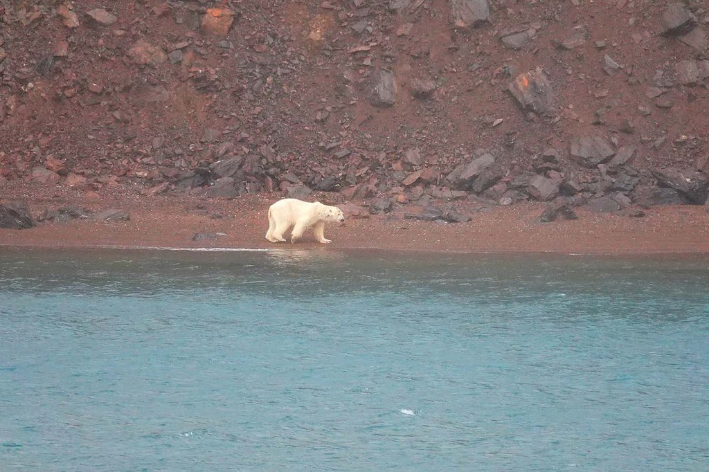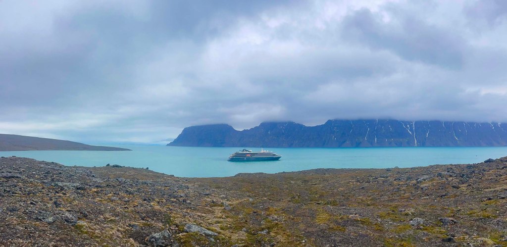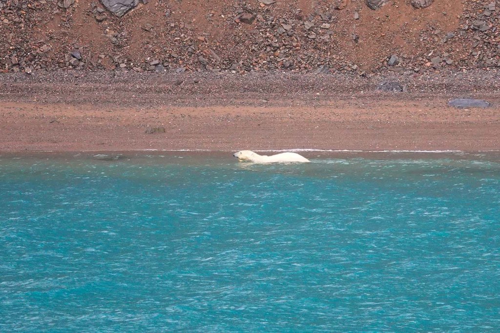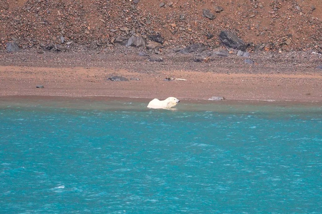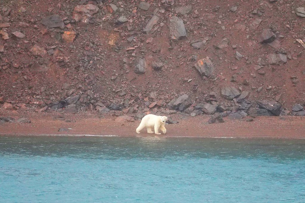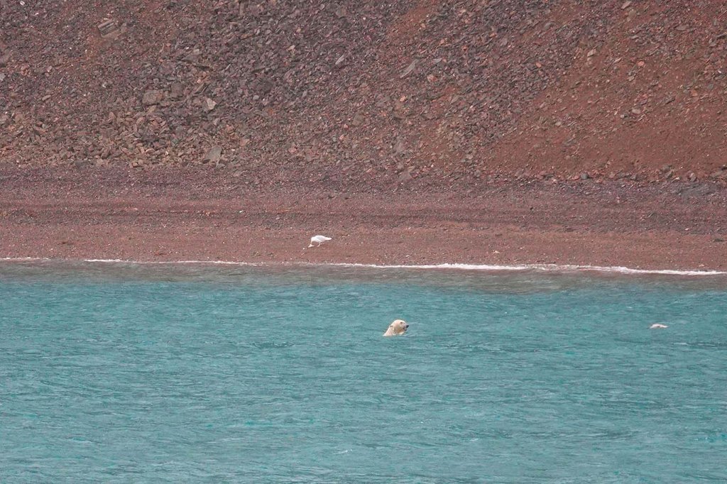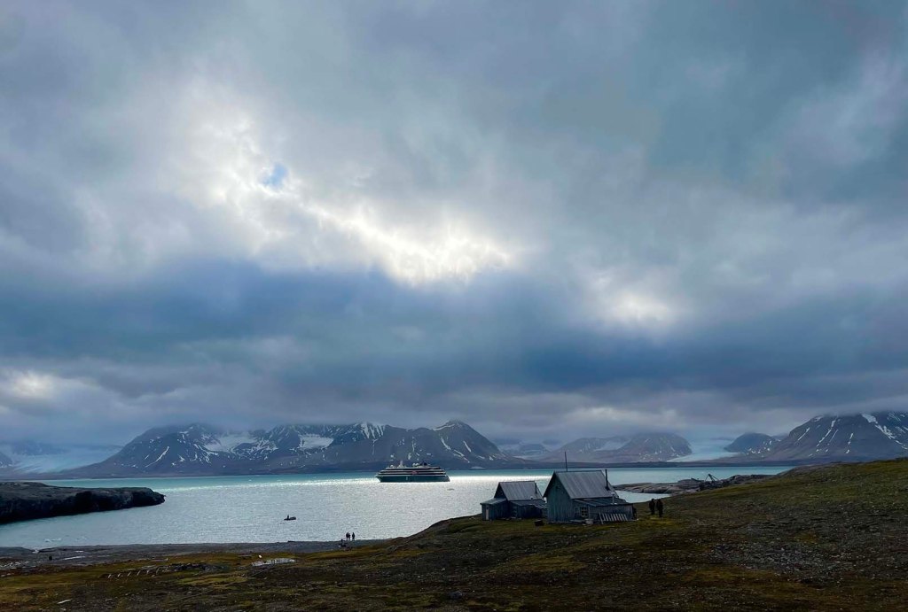 Alors que Zaza et Yann étaient en train de transpirer à la salle de sport et que Lola était encore dans les bras de Morphée, une annonce alerta tout le bateau à 7h15 du matin: un ours était visible sur le rivage! Tous les passagers arrivèrent sur le pont dans des tenues les plus diverses, pyjama, peignoir ou autre! Mais ce réveil en urgence en valait largement la peine. En effet, l’ours était très visible et sa silhouette blanche se détachait parfaitement sur le sable foncé de la plage. Nous avons pu l’observer pendant plus d’une demi-heure et nous l’avons vu nager, manger un poisson, courir. C’était magique! Une fois ses émotions passées, nous avons fait une nouvelle sortie en zodiac au glacier de Lilliehöök, 8 km de large pour 22 km de long. Malheureusement, ce glacier paie un lourd tribu au réchauffement climatique car il recule de 50 m par année. La deuxième expédition du jour nous a amené à Signehamna, lieu d’une ancienne station météo allemande secrète de la Seconde Guerre mondiale.